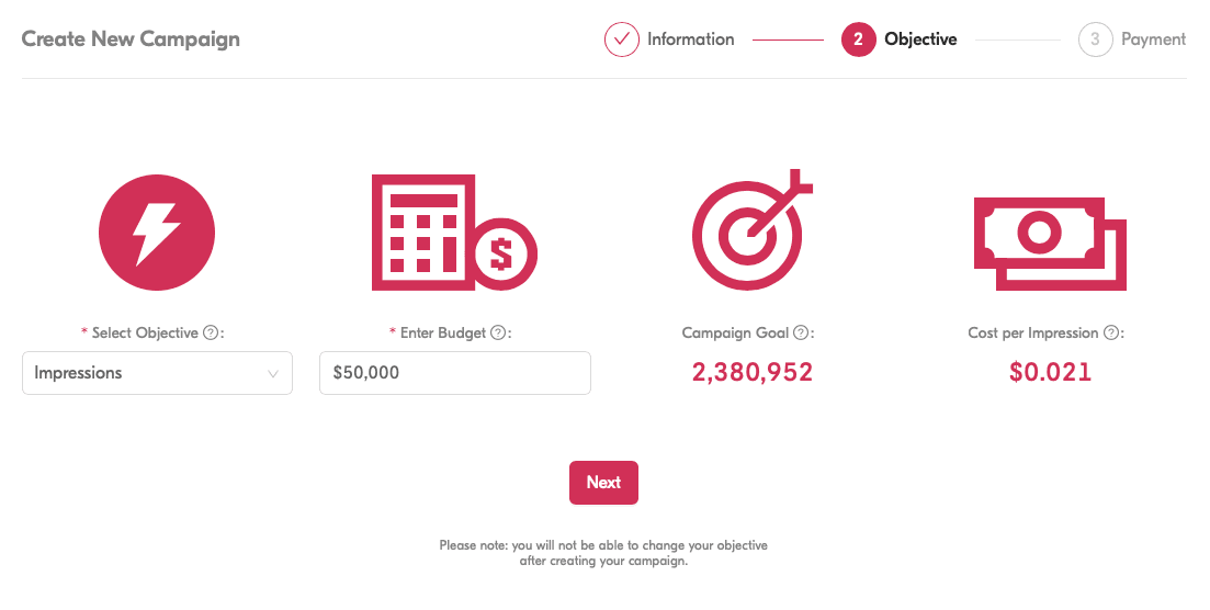 When creating your amp&go basic Campaign you’ll be prompted to select an objective from a set list: Impressions, Video Views, Engagements or Clicks (“Objective”), and to enter your budget for the Campaign (“Budget”). amp&go requires a minimum budget of $10,000.